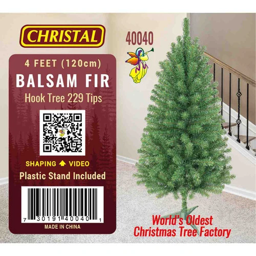 4FT Green Fir Tree Size: 120cm All Christal trees are constructed from recycled PVC plastic rather than brand new plastic, which helps to lessen our reliance on nonrenewable energy sources. Instead of using lead, we use tin-based stabilisers in our PVC, so our trees are completely safe for use. To ensure that our environmentally conscious and responsible customers may celebrate Christmas with their trees for at least 30 years, we only utilise the highest quality raw materials and tree pieces.Christal brown boxes are crafted using sturdy cardboard that has been recycled from other sources. Our brown boxes are ideal for storing Christmas trees year after year, and we encourage consumers to do so. All Christal tree trunks and wire branches are protected from rust for at least 30 years thanks to a special coating applied to both sides of the metal pipes during production. 4ft Christal Balsam Fir Hook Tree with 229 Tips 24” Widest Point Diameter Plastic Christmas Tree Stand Included 100% Recycled PVC Plastic Tree Tips Flame Retardant PVC Plastic Needles Exceptional Quality for 30 Years of Use