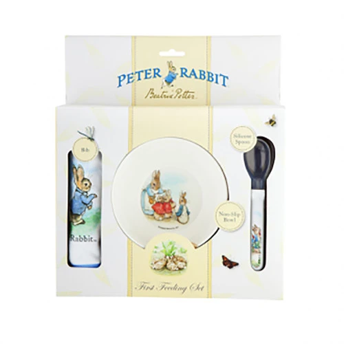 Beatrix Potter Peter Rabbit First Feeding Set Size: 9 x 25 x 6.5cm Age: 6+ Peter Rabbit from the world of Beatrix Potter  first feeding set includes silicone spoon, non-slip melamine bowl and  a cotton bib. This would be ideal for introducing solids to a baby and would also be a gorgeous gift.