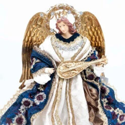 Ivory Blue Brocade Lace Standing Angel With Mandolin Halo – 25cm