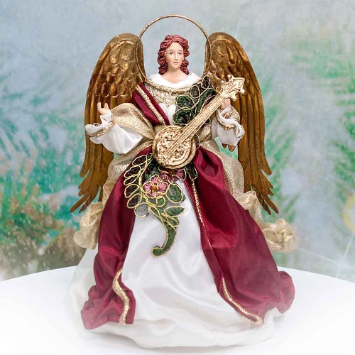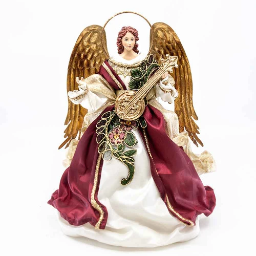 Ivory Burgundy Standing Angel With Mandolin Halo Size: 25cm This Angel features a charming combination of beige, burgundy, and gold hues. This angel can also be utilised as a sophisticated table centrepiece, tree topper, or as part of your festive decorations. Â