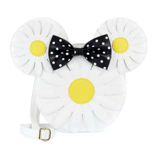 Loungefly Minnie Mouse Daises Crossbody Bag Size: 33cm W X 28.5cm H X 7.5cm D A symbol of fun and hope herself, Disney’s Minnie Mouse is perfectly paired with daisies in this beautiful design by Loungefly! The body of the bag is shaped like Minnie’s head, abloom with daisies as ears and topped off with a black and white polka dot bow – Minnie’s signature accessory. Wherever you go with this bag, sunshine is sure to follow! Product Features: Faux leather Adustable shoulder strap Applique Printed details
