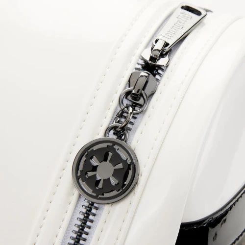 Loungefly Star Wars Stormtrooper Lenticular Mini Backpack Size:  23cm W x 27cm H x 11cm D This backpack takes the shape of a Stormtrooper’s helmet, complete with its built-in infiltration system on the front zipper compartment.  The inner lining bursts with colour, featuring a collage of Stormtrooper panels from the original Star Wars comics. Sturdy gunmetal hardware fastens the backpack and even features a Galactic Empire logo zipper charm! A lenticular effect placed in the eyewear shows Han Solo, Chewbacca, C-3PO, Princess Leia and R2-D2 in the Stormtrooper’s sights  Features: Faux leather Adjustable shoulder straps   This backpack is an officially licensed Disney product.    Â