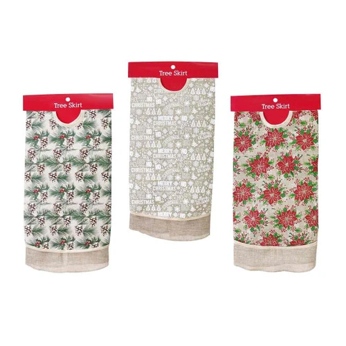 Natural Print Tree Skirt (3 Styles) Size: 100cm This stunning Christmas tree skirt shimmers with understated Christmas elegance and will effortlessly cover the base of your tree, completing your Christmas tree’s decor with a flourish of holiday cheer. This tree skirt has a cosy design that you’ll like! Styles: Frosted Pinecone, Festive Merry Christmas, Red Poinsettia Each sold separately, subject to availability.