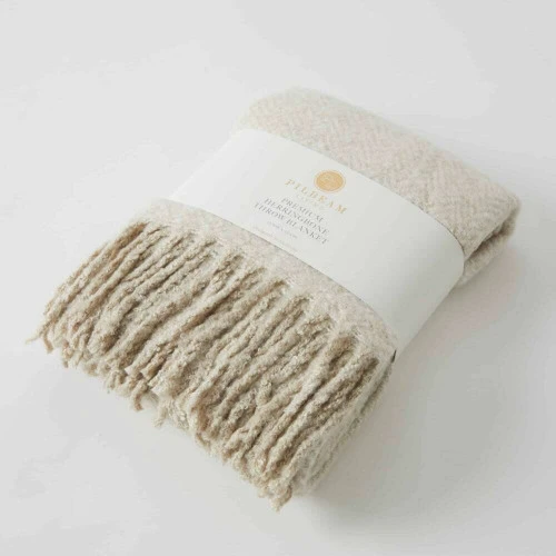Oatmeal Herringbone Acrylic Throw Size: 127cm x 152cm Add warmth and comfort to your home with this super soft and stylish throw blanket, which is the perfect size to drape across the end of the bed, throw on the couch or just cuddle up in! Featuring a herringbone pattern design with a solid colour fringe, this throw is a fabulous addition to any room. Made from high quality and comfortable acrylic material with easy care properties. Care: Cold gentle machine wash, mild detergent, do not bleach, line dry in shade, do not iron Â
