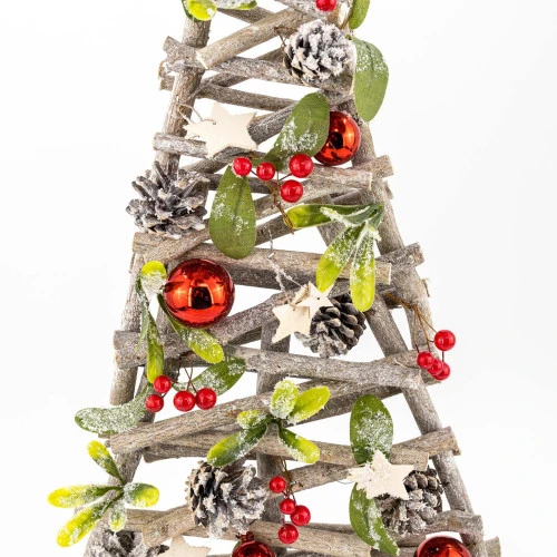 Red Bauble and Pinecone Twig Tree Size: 68cm The unique design sees a tree shape formed from a series of criss-crossing branches. Pinecones, sprigs of spruce, and cut-out stars replicate the look of a full-sizes tree. Perfect for your dining table, a sideboard, or any home with little space to spare, this charming table-top Christmas tree puts a rustic spin on a festive classic.
