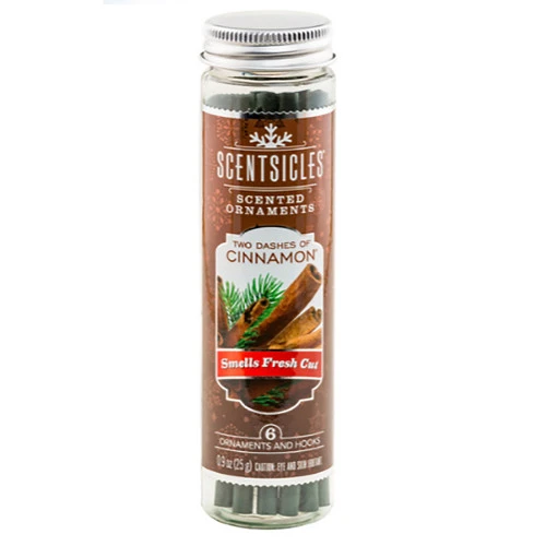 Scentsicles Two Dashes of Cinnamon This is perfect for awakening your senses and bringing a true feel of Christmas into your home. A great way to give your tree a Christmassy warm and spicy cinnamon aroma. Designed to naturally blend in, simply hang or hide in trees, wreaths, garland, and holiday décor. Each bottle comes with six scented ornaments and swirl hooks for easy hanging. Scent lasts up to 30 days.
