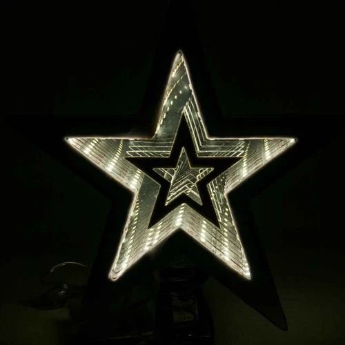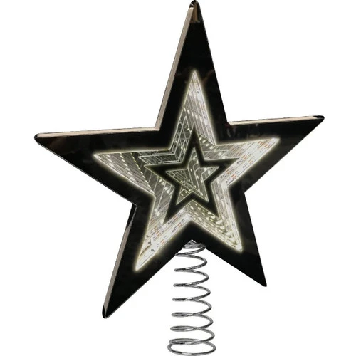 White Star Infinity Christmas Tree Topper Size: 18cm This incredible infinity star with LED lights, sits on top of your Christmas Tree, and gives the illusion that the lights never end on both sides. Low voltage: 4.5 volts