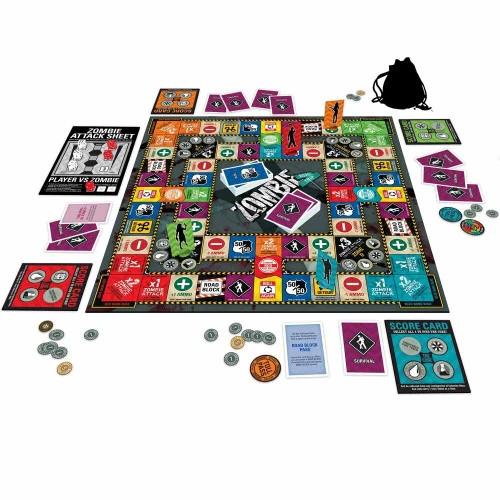 Zombie Road Trip Board Game An insane fun strategy game. We can only rely on you at this point. To win, you have to collect all four tokens before anyone else. Are you going to make it to the cure? Explore the Wasteland in hope of finding relief. Protect yourself from the zombies while you complete the game’s objectives. Gaining early access to the inner track will give you a leg up on the competition as you race to return cure tokens from known infection areas to your centre of operations. The winner is the player who returns to their base with one of each of the four cure tokens first. Actually, that thing did occur. There was a true zombie apocalypse, just as in the movies, TV shows, video games, and other forms of popular media. Neither the cause nor the effect are known to us. We can only assume that the norms have changed. No longer is death the end of the line. The dead have awakened, they are among the living, and they intend to consume them. However, there is still reason for hope. A short wave radio transmitter started broadcasting a looping message just before the power grid failed. There was a cure described in detail. Includes: 1 Game Board (as shown) 1 Rule Book 4 Unique Character Pieces 4 Unique Score Cards 16 Villain Tokens 45 Toll Passes 128 Hit Tokens 1 Fabric Pouch 50 Action Cards 50 x 50/50 Cards 6 Dice
